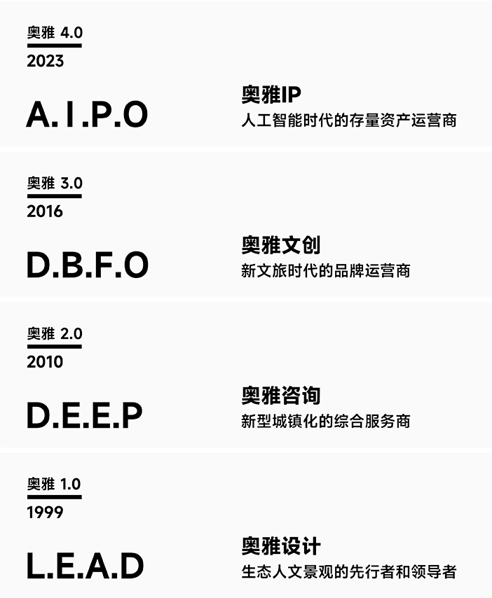 經過多年的戰(zhàn)略布局與發(fā)展,在李方悅女士的推動下,奧雅股份從一家設計企業(yè)成功轉型成為新銳的輕資產文旅開發(fā)運營企業(yè)。奧雅以“創(chuàng)造更美好的人居環(huán)境”“讓空間賦予生命”為使命,以雙輪驅動+雙引擎為發(fā)展格局,即創(chuàng)意設計+親子文旅雙輪驅動、AIGC+IP雙引擎;經營業(yè)務范圍涵蓋創(chuàng)意設計、親子文旅、數字科技等領域,為城市更新、鄉村振興、文化古城等不同場景提供全程化咨詢與綜合運營服務。在實現企業(yè)價值和理想的同時,解決當代中國的實際問題與需求,創(chuàng)造具有地域特色、人性化和充滿活力的新舊城市空間和綜合文化旅游項目。